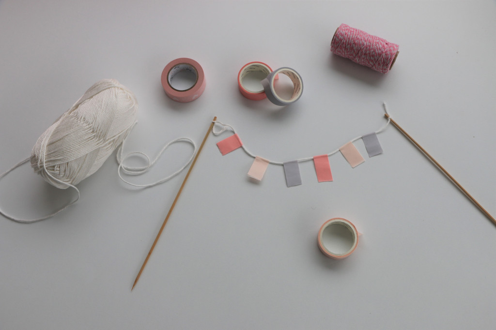 Nun sind die kleinen Wimpel dran. Ich nutze gerne Washitape. Es ist schön bunt und die Möglichkeiten sind nahezu unendlich. Du brauchst lange Streifen, die du mittig auf deiner Schnur platzierst. Ich klebe die Streifen nun auf einer Unterlage fest, damit ich die Position genau festlegen kann. Washi Tape lässt sich rückstandslos wieder abziehen.