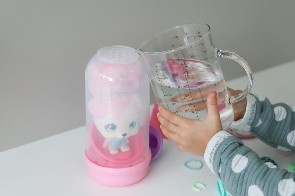 - Nun musst du Wasser in die obere Öffnung gießen. Gieße so viel, bis du die bunten Haare erkennen kannst.
